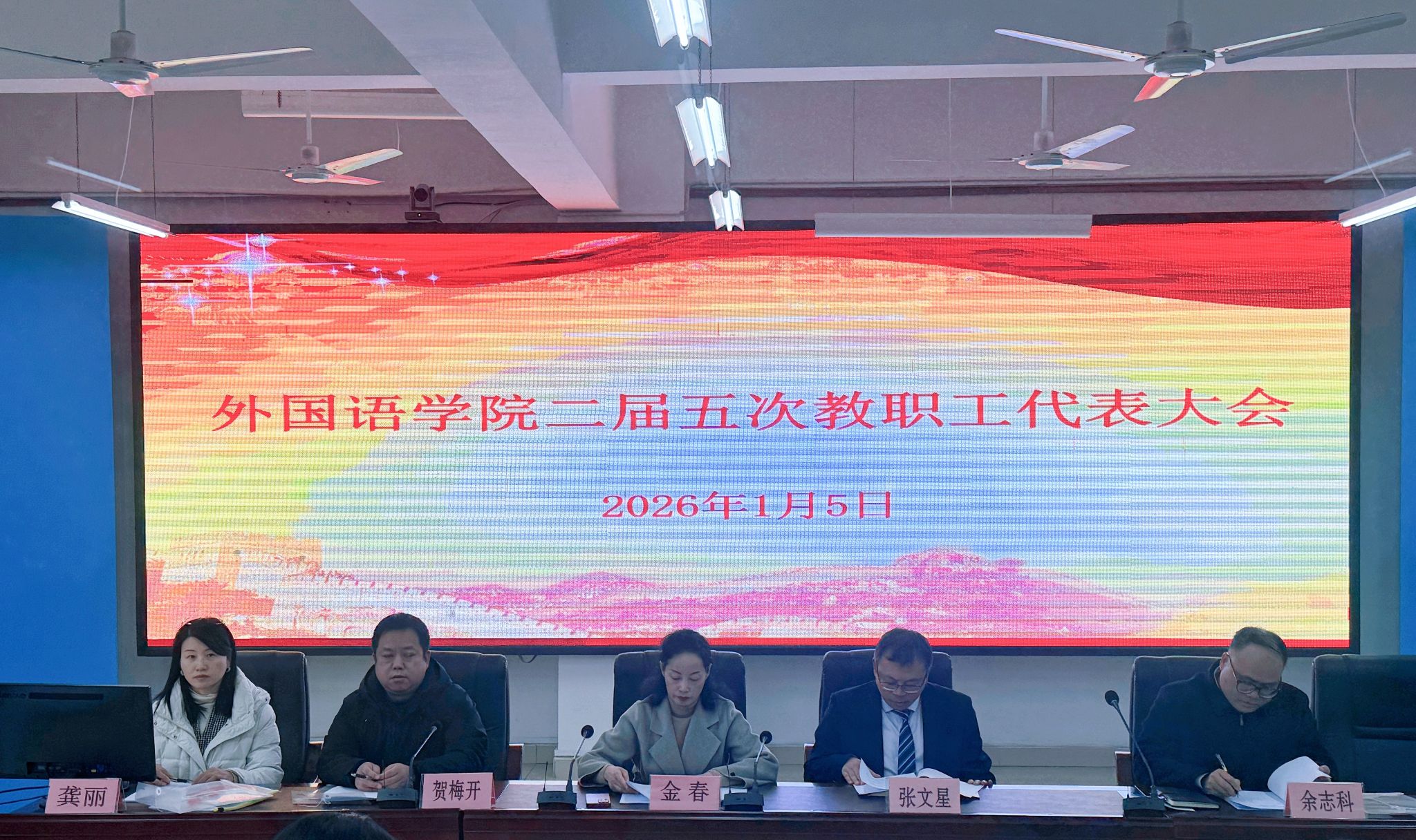 20261月5日,外国语学院在红角洲校区W3101会议室召开二届五次教职工代表大会。学院党政领导及教职工代表齐聚一堂,积极建言献策,共商学院高质量发展大计。学院党委书记金春致开幕词,代表学院党委对会议的召开表示热烈祝贺。她强调,教职工代表大会是学院管理体制的重要组成部分,是教职工依法参与学院民主决策、民主管理、民主监督的基本形式和重要平台,也是凝聚全院智慧力量、推动事业高质量发展的重要渠道,希望全体代表以高度的政治责任感和强烈的主人翁精神,...