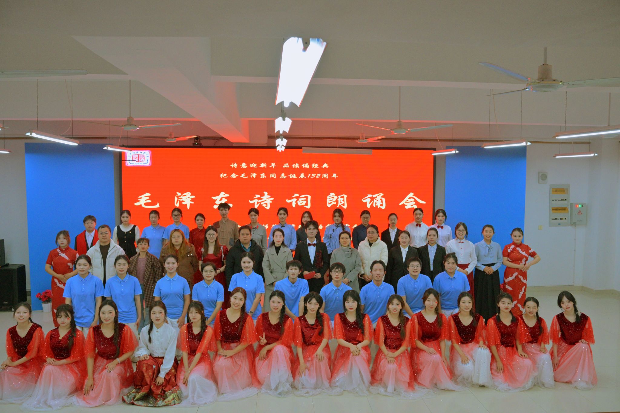 2025为进一步学习贯彻党的二十届四中全会精神,纪念毛泽东同志诞辰132周年,喜迎2026新年,12月26日晚,外国语学院在文科楼W3101举办毛泽东诗词朗诵会。学院师生代表欢聚一堂,感悟毛泽东诗词中的理想信念与革命情怀,讴歌毛泽东同志的丰功伟绩。朗诵会在《东方红》乐曲中拉开帷幕,深情恢弘的旋律引发观众对伟大领袖毛主席的深切缅怀。合诵《沁园春·长沙》《念奴娇·井冈山》,独诵《减字木兰花·广昌路上》,笔诵和鸣《清平乐·会昌》,再现了革命年代激情澎湃、...