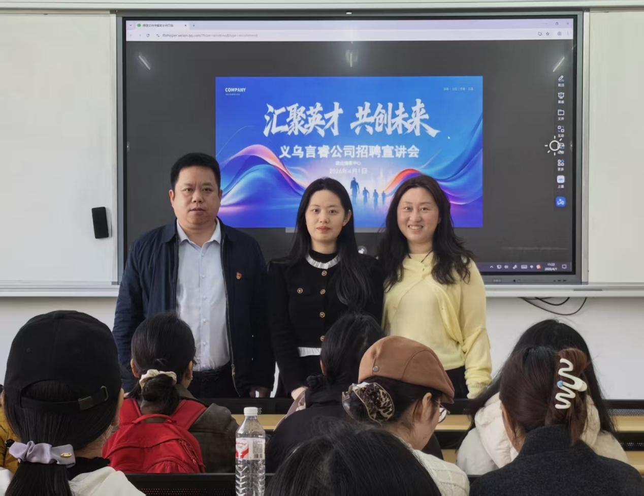 为进一步拓宽大学生的就业视野,对接企业资源,外国语学院于4月1日上午,在红角洲校区W3102教室举办了义乌企业专场招聘会。特邀请义乌言睿网络科技有限公司来院宣讲,吸引众多毕业生到场参与。