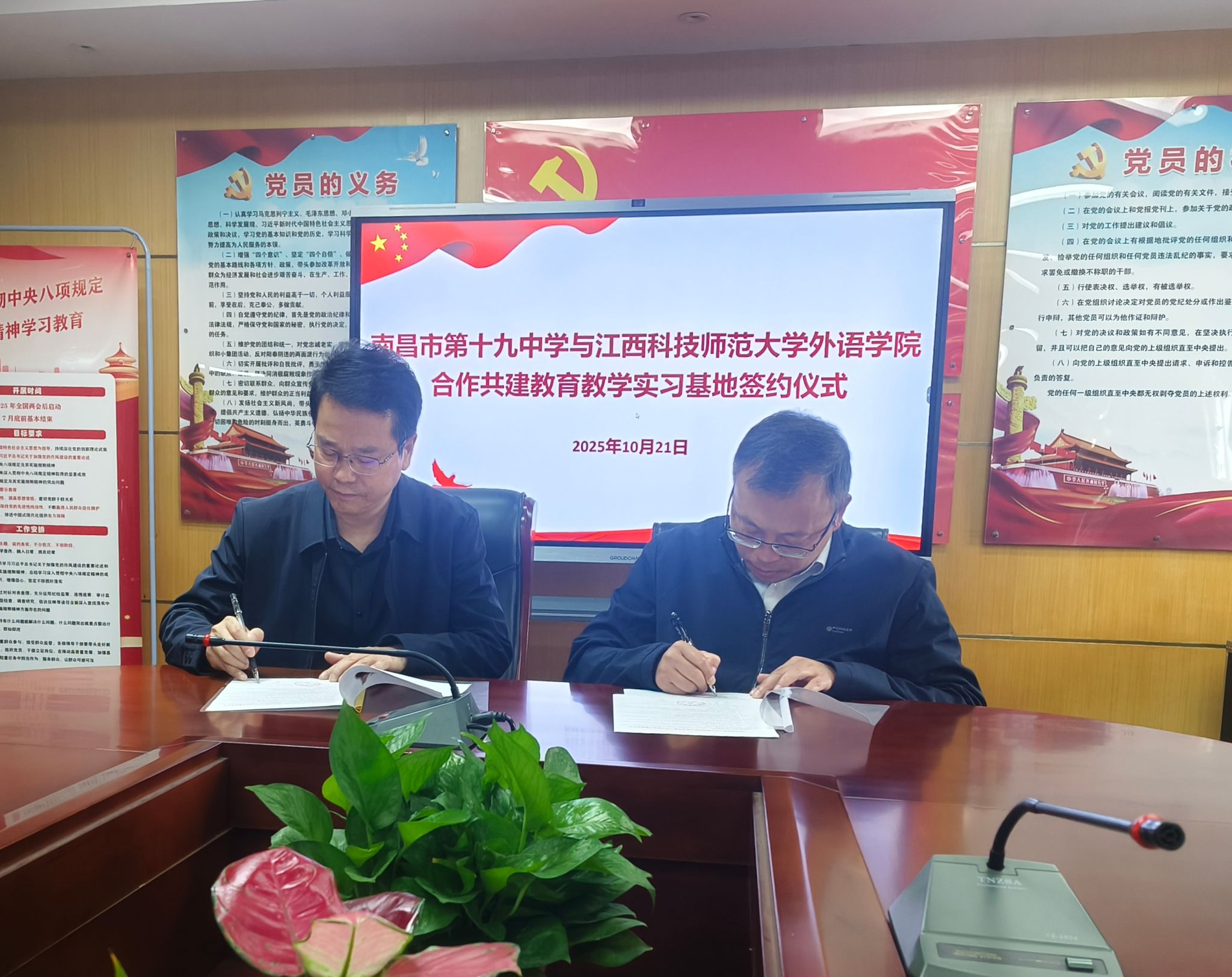 2025年10月21日,江西科技师范大学外国语学院教育教学实习基地协议签约仪式在南昌市第十九中学举行。外国语学院党委书记金春、院长张文星、副书记贺梅开、副院长余志科、副院长(挂职)郑静、相关教研室负责人,南昌市第十九中学党委副书记、校长龚循亮、副校长陈卫刚、教务处相关负责人等参加仪式。
