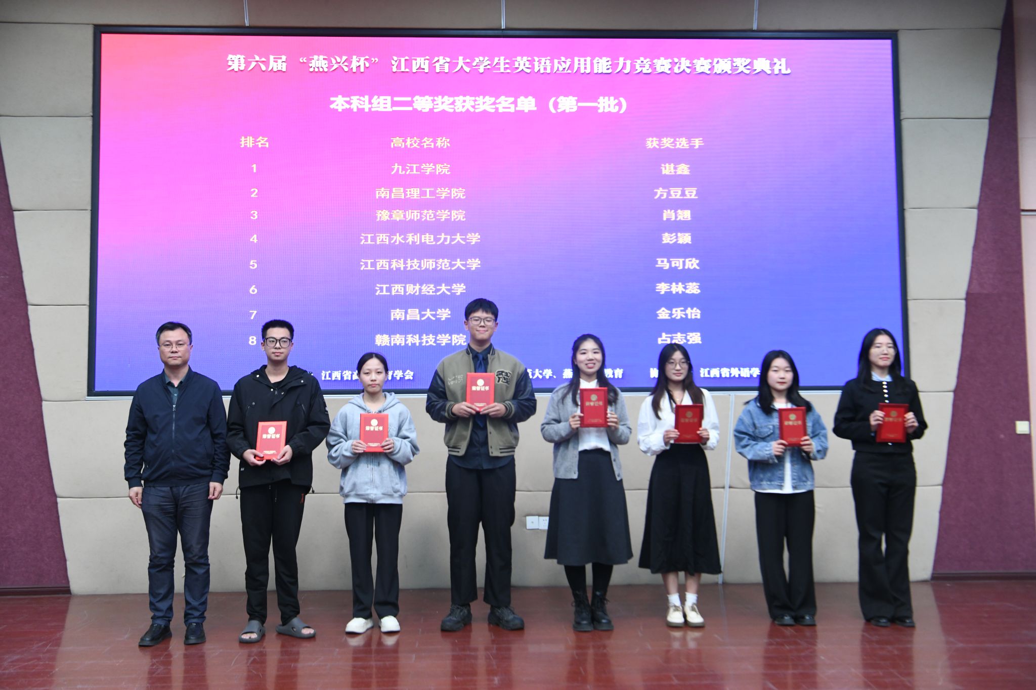 图为获奖选手徐志琴(右一)、黄宇鑫(右三)领奖照片