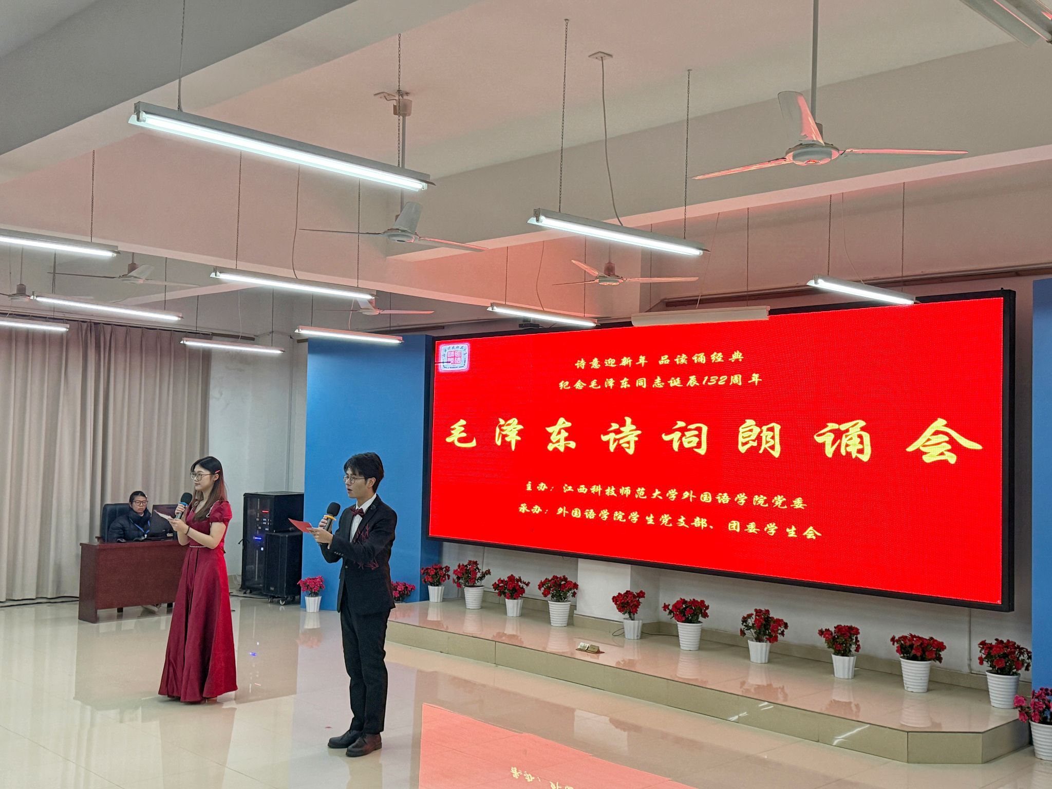 为进一步学习贯彻党的二十届四中全会精神,纪念毛泽东同志诞辰132周年,喜迎2026新年,12月26日晚,外国语学院在文科楼W3101举办毛泽东诗词朗诵会。学院师生代表欢聚一堂,感悟毛泽东诗词中的理想信念与革命情怀,讴歌毛泽东同志的丰功伟绩。