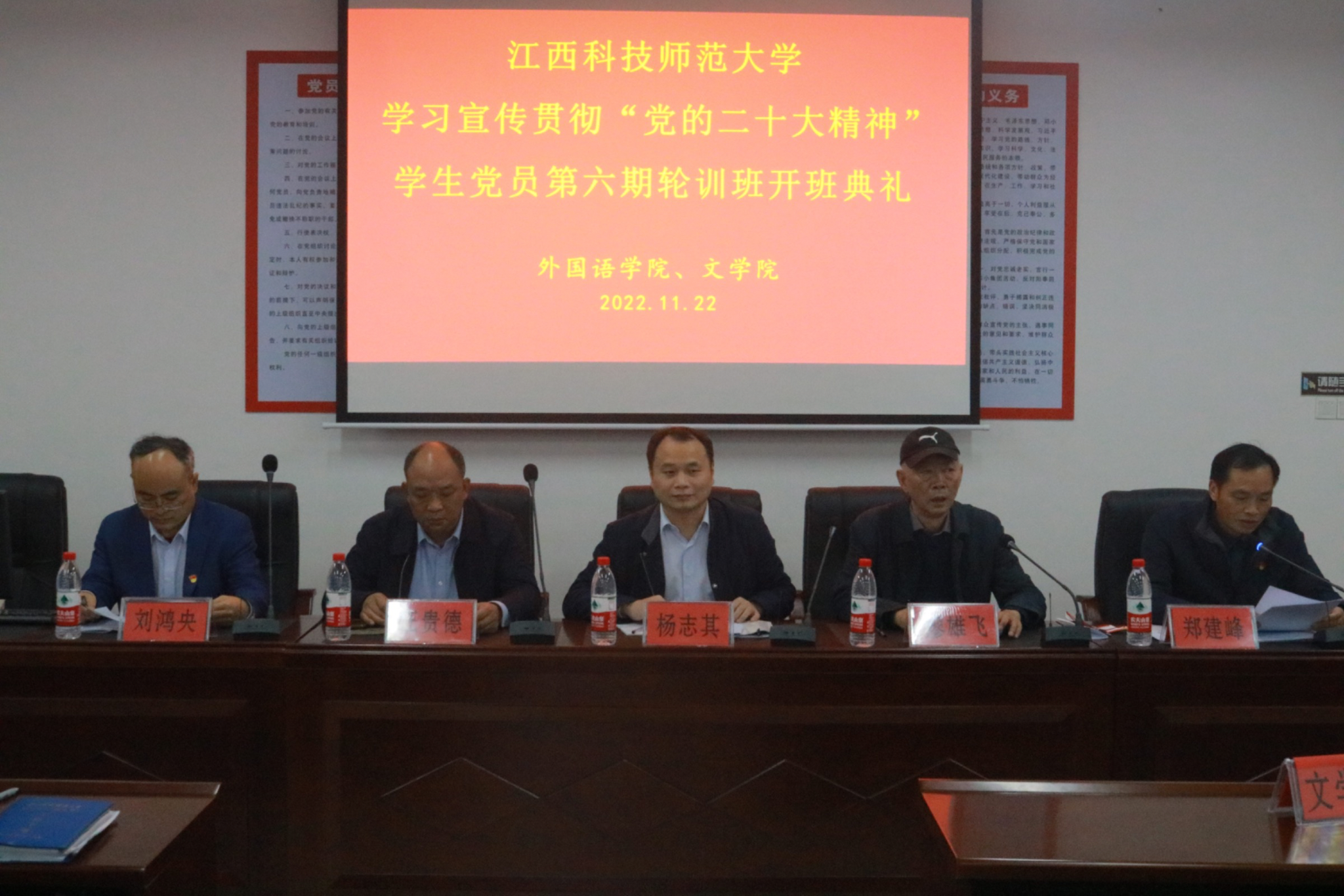 校党委委员、党委组织部部长杨志其作讲话。他强调,学习贯彻党的二十大精神是当前和今后一个时期每一位党员的首要政治任务。各学院党委要切实把学习贯彻党的二十大精神与深入贯彻习近平总书记关于青年工作的重要思想紧密结合起来,同推动落实为党育人、为国育才根本任务结合起来,积极引导学生党员发挥先锋模范作用,进一步坚定学生党员的理想信念,以更高标准、更严要求,示范引领带动,带头学深悟透党的二十大精神实质,做到先学一步、学深一层,为广大青年学子作示范、作表率。他对全体学员提出寄予和希望:学员们要以认真学习宣传贯彻党的二十大精神为契机,践行新时代“强国有我,请党放心”青春誓言,响应习近平总书记在党的二十大报告中向广大青年发出的时代号召,坚持学以立德,在增强党性修养上下功夫;坚持学以增智,在提高能力素质上下功夫;坚持学以致用,在强化实践历练上下功夫。