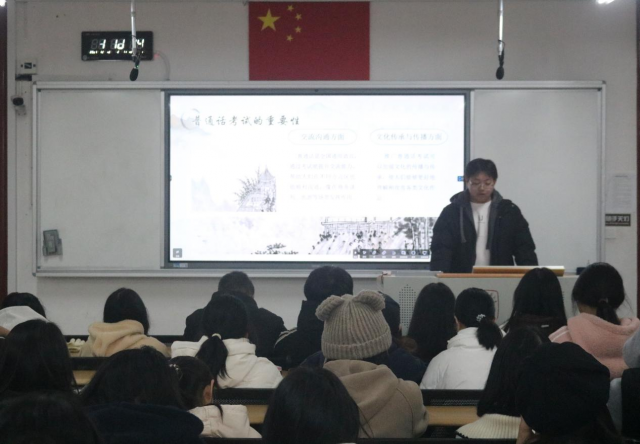 此次宣讲会邀请了两名在普通话水平测试中取得优异成绩的同学分享经验。2023英语(一本-师范)1班李展鹏详细介绍了普通话水平测试的主要环节,测试分为四个部分:单音节字词朗读、多音节词语朗读、短文朗读和命题说话。他指出,在考试过程中要注重字词的细节处理、保证声母准确及韵母饱满。与此同时,他还着重强调了规范普通话对于教师职业的重要性,鼓励同学们说好普通话,提高师范生的言语素质及表达能力。