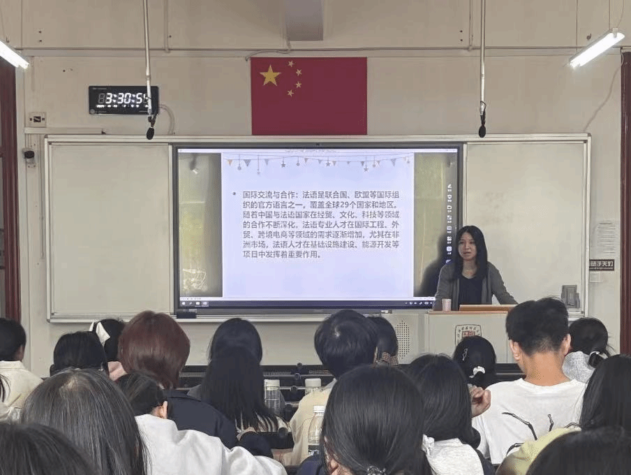 郑静立足商务英语(中法合作)专业特色,从专业历史、人才培养目标、课程体系、在法课程、学习要求、学习规划六个方面展开讲解。她详细介绍了专业的课程设置逻辑、学习方法要点、在法课程学习注意事项,以及国际交流资源的利用路径,强调“语言能力+商务素养”的复合能力培养重点,鼓励学生积极考取与专业相关的资格证书,并为新生制定清晰的学业与职业目标。