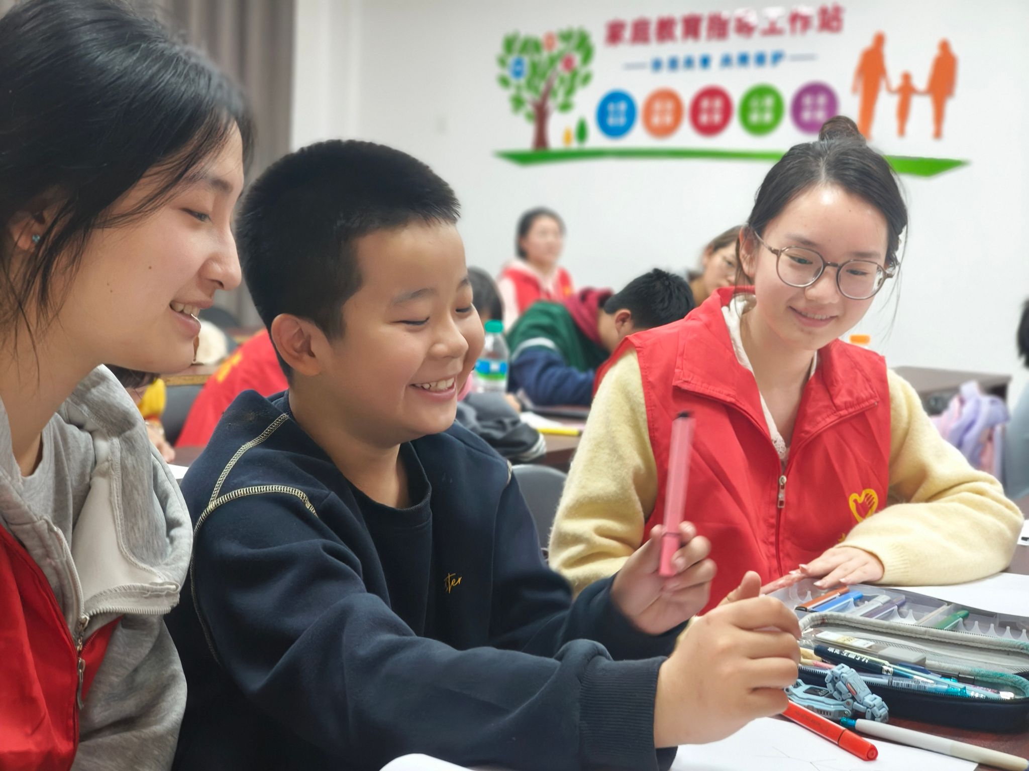 孩子们在志愿者的耐心引导下积极参与活动,通过自我表达与互动交流,发掘优势能力、识别情绪类型、理解人际联结,收获成长感悟。活动过程中,志愿者们时刻关注小朋友们的状态,及时回应需求、维护秩序,确保活动安全有序推进,现场处处洋溢着真诚友善的氛围。