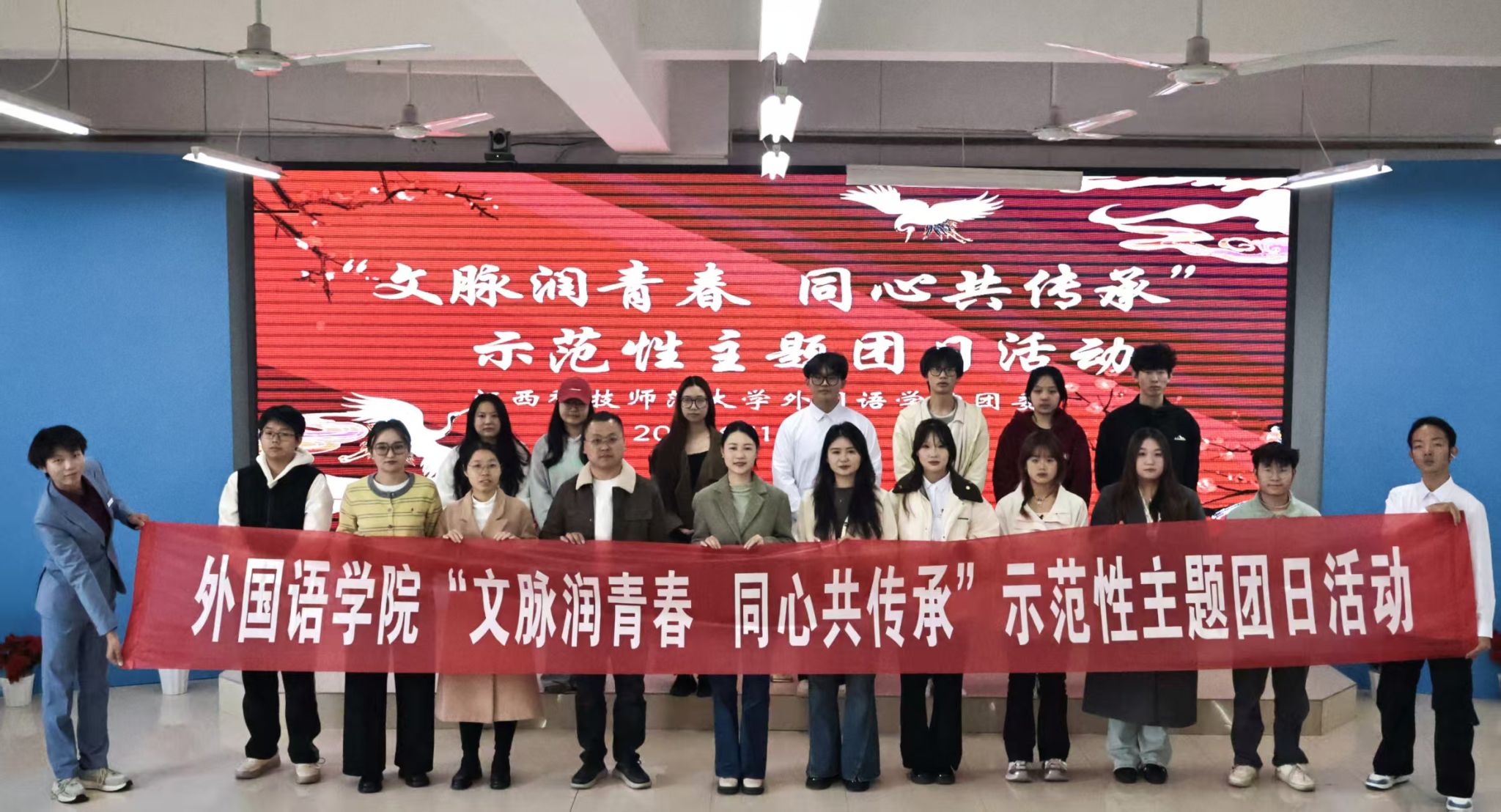 为深入学习贯彻习近平文化思想,引导团员青年坚定文化自信,厚植家国情怀,11月25日,由校团委主办、外国语学院承办的“文脉润青春 同心共传承”示范性主题团日活动在红角洲校区文科楼W3101会议室举行。校团委副书记(挂职)刘佳晨、外国语学院团委负责人皮卫阳及各学院团干代表参加活动。