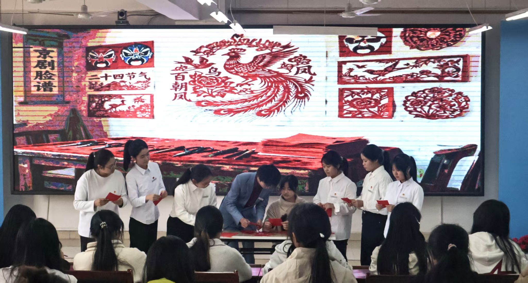 活动伊始,全体团员重温入团誓词、高唱团歌。随后,“红五星”快板队带来的《诵伟人毛泽东》,以铿锵有力的节奏传递红色精神;“红五星”宣讲团演绎的情景剧《剪纸里的偏见与温度》,生动展现了非遗剪纸所蕴含的深厚底蕴与时代温度;外语讲述中国传统节日节目,彰显了青年学子对中华优秀传统文化的理解与担当;集体朗诵《何以华夏 何以中国》则诠释了中华文明的源远流长与灿烂辉煌。互动环节,同学们通过“开盲盒”形式积极抢答传统文化词汇的英文表达,并沉浸式体验非遗漆扇制作,现场气氛活跃热烈。活动在合唱《我的祖国》的动人旋律中圆满结束。