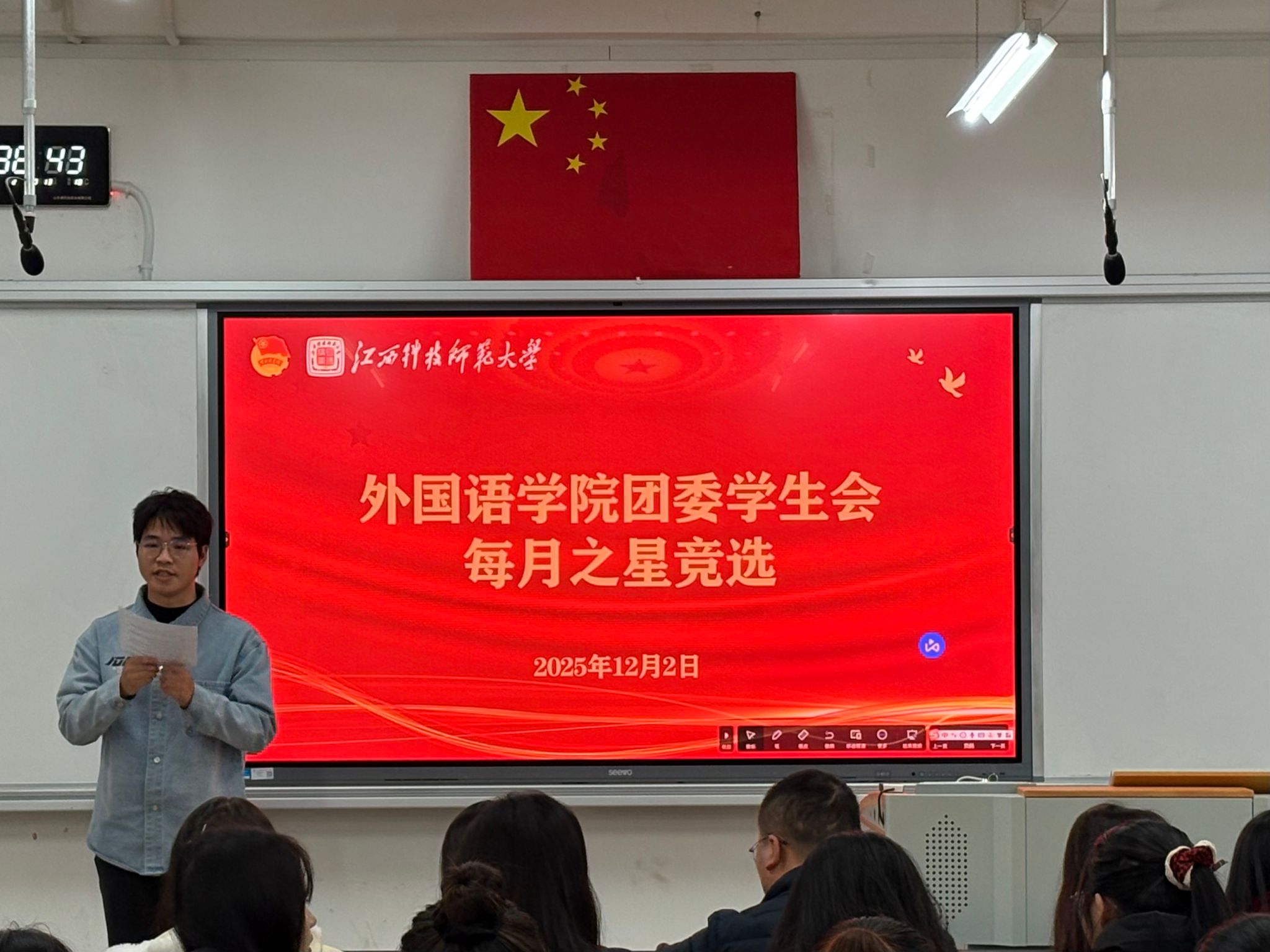 为加强队伍建设、激发工作热情、提升工作效能,12月2日,外国语学院于文科楼W3107教室开展“每月之星”评选。外国语学院团委负责老师皮卫阳、主要学生干部担任评委,团委、学生会工作人员参加评选。