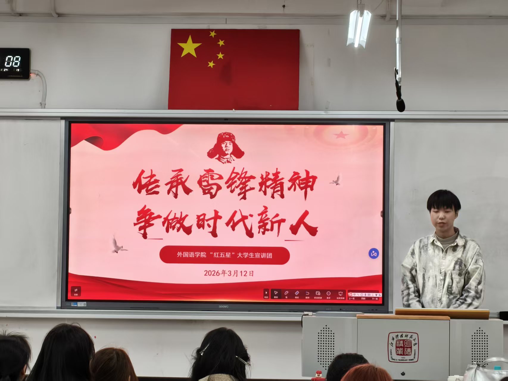 为深入弘扬雷锋精神、涵养奉献情怀、赓续榜样力量,激励新时代青年增强服务社会、担当使命的责任意识,3月12日,外国语学院“红五星”大学生宣讲团在W3107举办了“传承雷锋精神,争做时代新人”主题宣讲活动,生动阐释了雷锋精神的时代内涵与当代价值。