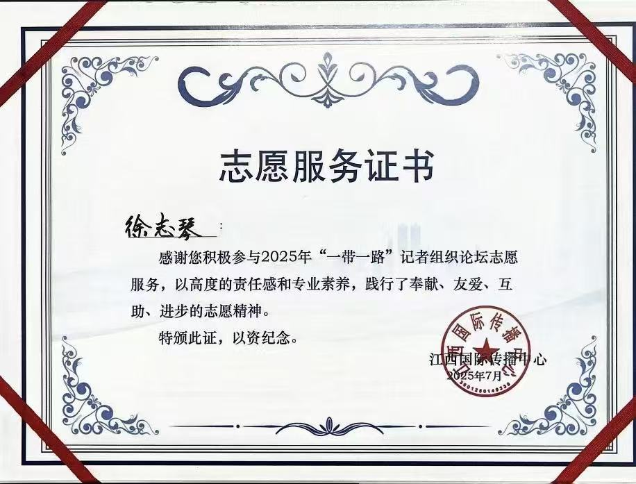 实践赋能,传递青春温度。课外实践中,徐志琴积极践行全面发展理念,在志愿服务与文化交流领域发光发热。她先后参与2025年“一带一路”记者论坛、世界VR产业大会、高层次人才创新创业大会等多项重要活动的志愿服务工作,在马来西亚沙巴大学文化交流活动中获评“优秀志愿者”,以真诚服务传递中国青年温度;同时,她凭借积极向上的精神风貌获评2025年智慧体育“优秀个人”,尽显青春活力与责任担当。