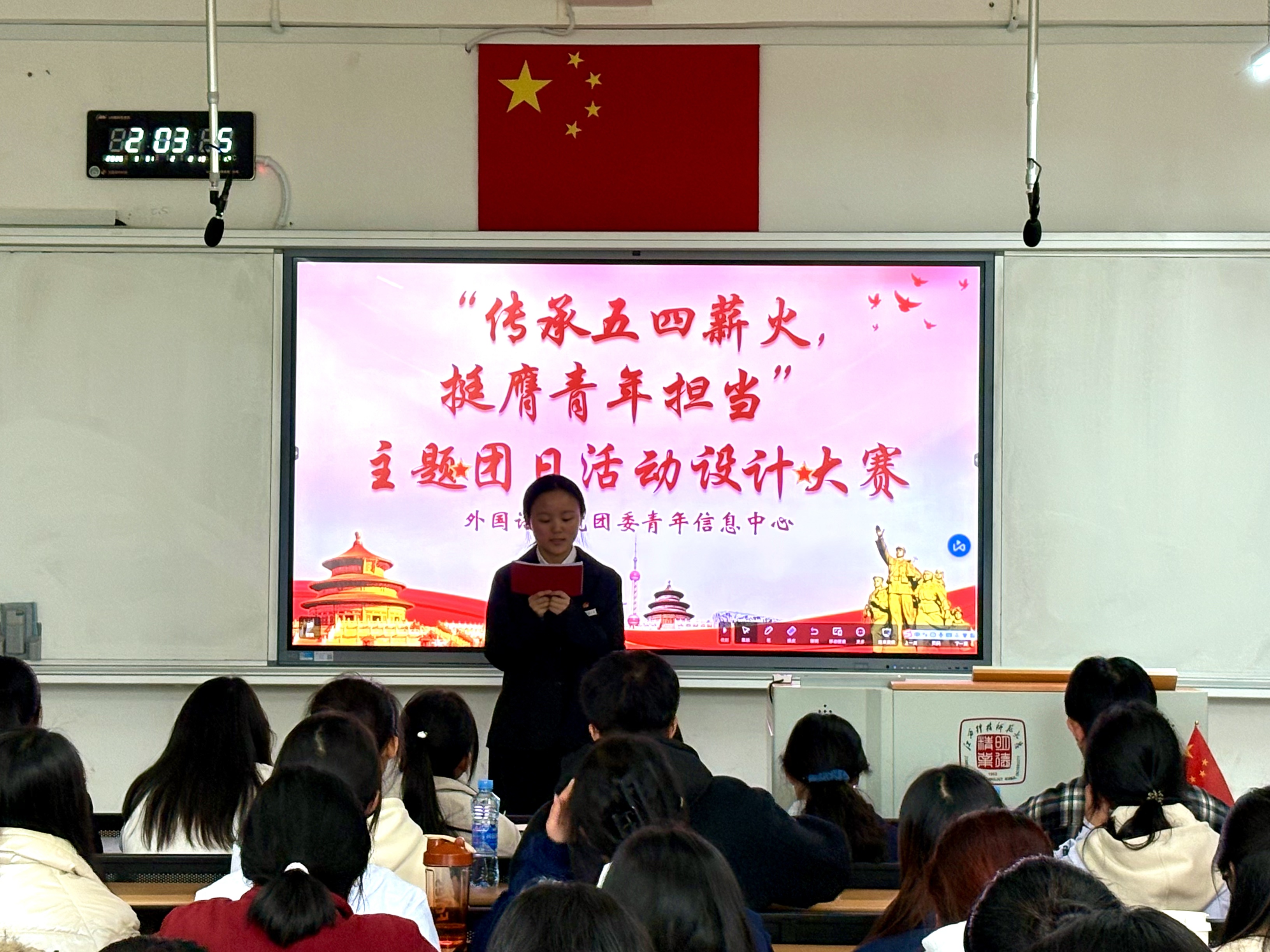 为弘扬五四精神,砥砺青春之志,彰显青年担当。3月31日,外国语学院于W3108教室开展了“传承五四薪火,挺膺青年担当”主题团日活动设计比赛初赛。比赛邀请了团委负责老师皮卫阳和学生干部担任评委,共八支队伍参赛。