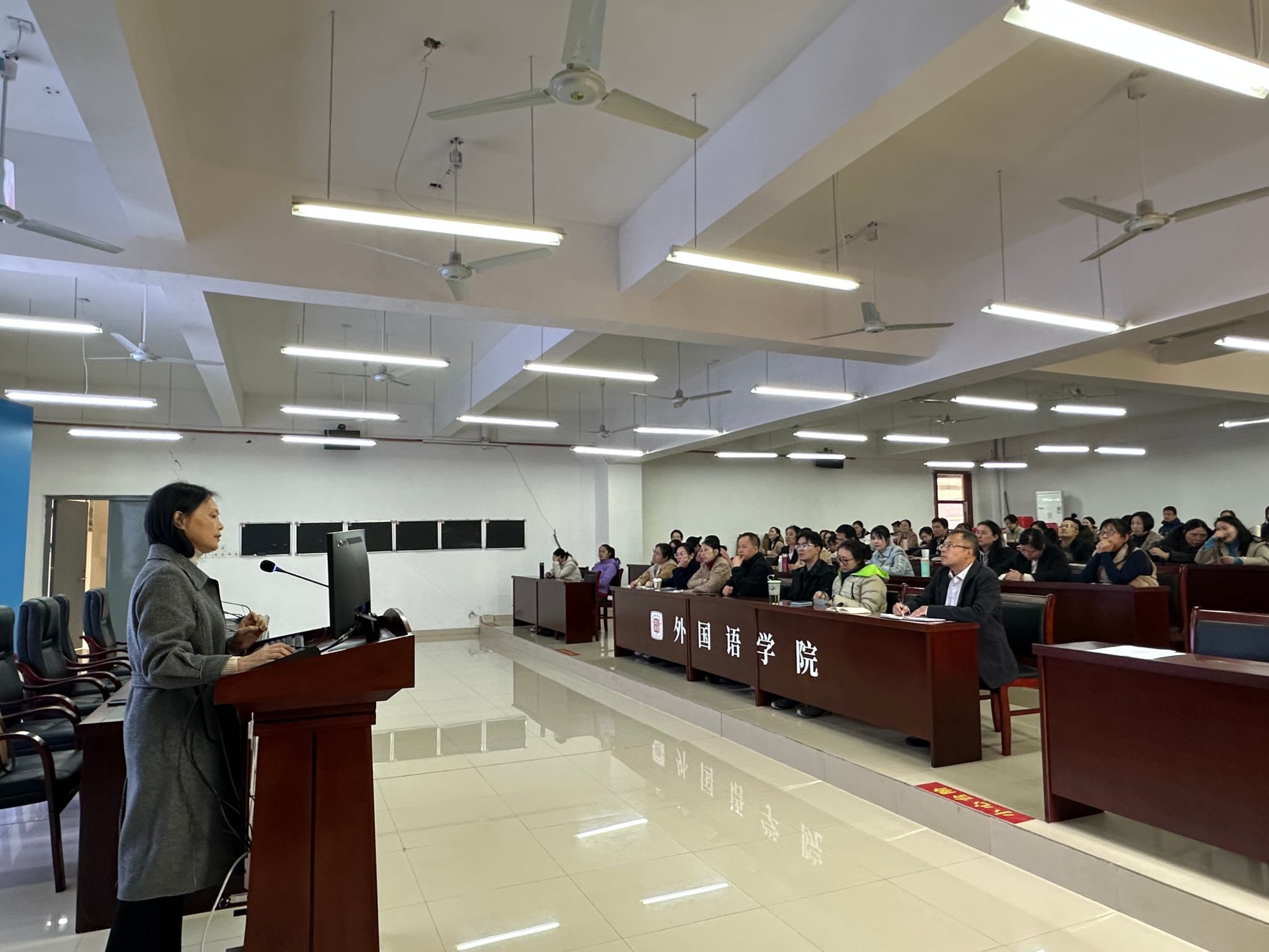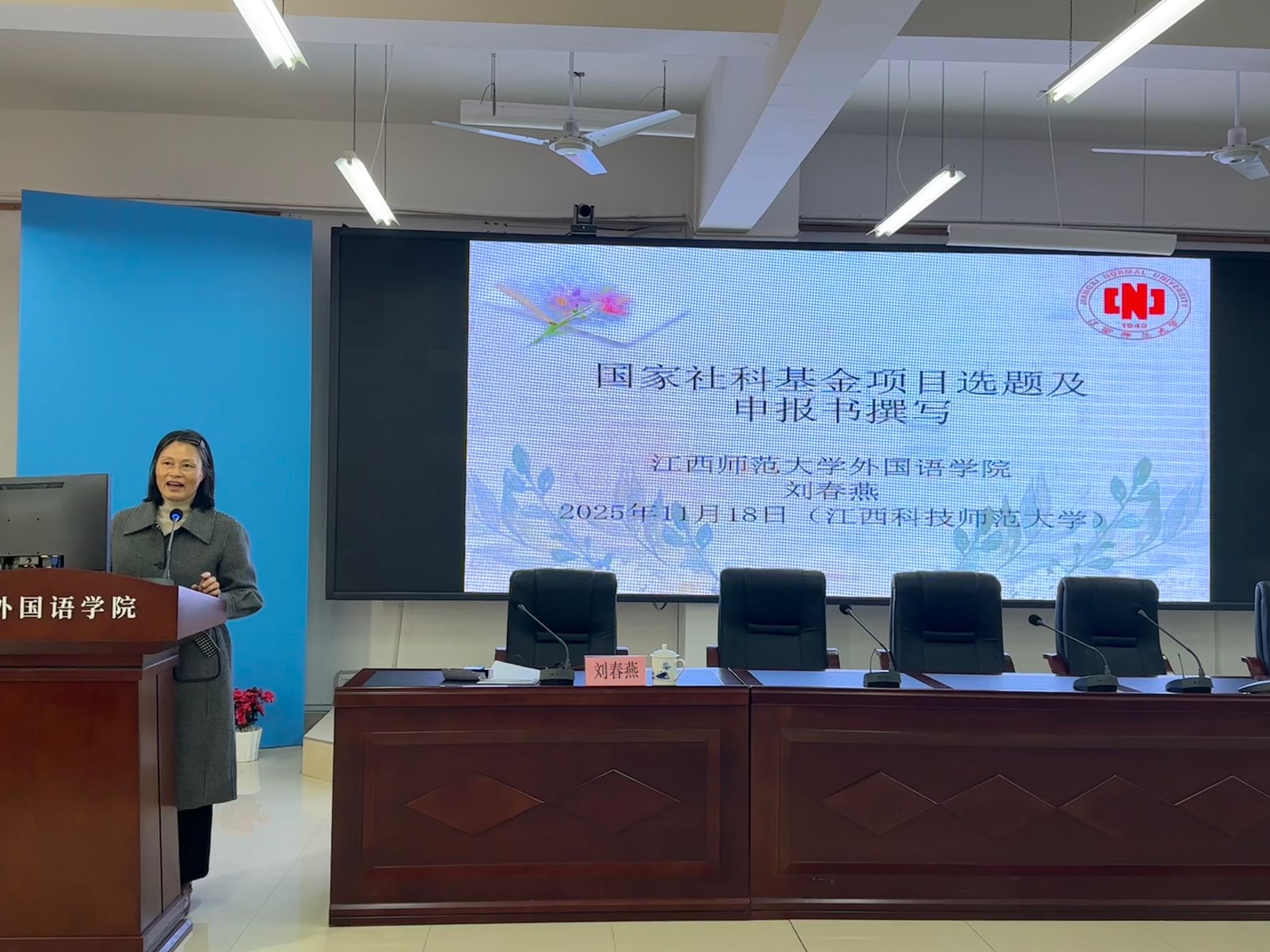 11月18日下午,学院特邀江西师范大学外国语学院刘春燕教授在W3101作题为《国家社科基金项目选题及申报书撰写》的专题讲座。外国语学院领导班子、全体教师及研究生代表百余人到场聆听,讲座由院长张文星主持。